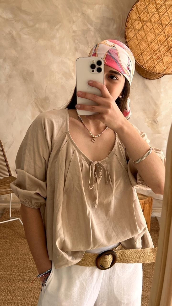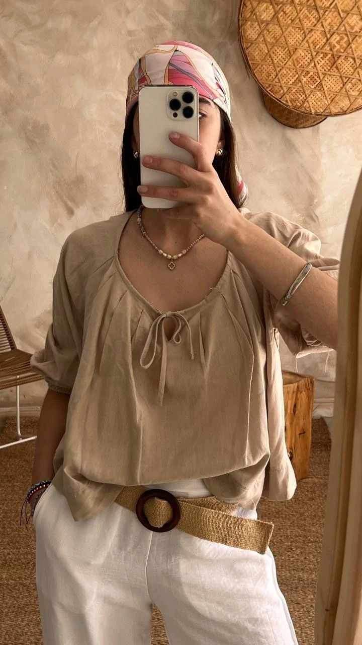 Descubrí la Blusa Carla, una prenda que destaca por su confección en lino rústico de color beige, ideal para quienes buscan combinar comodidad y estilo con un toque natural y sofisticado.
