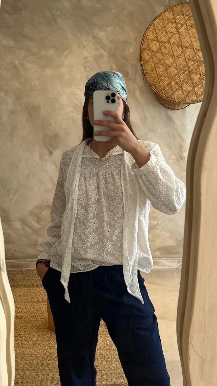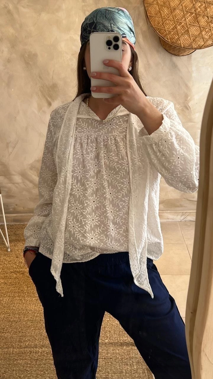 Descubrí la Blusa Hilda, una prenda diseñada para aportar sofisticación y estilo a tu guardarropa. Confeccionada en un tejido que simula el broderie tradicional, esta blusa blanca destaca por su detalle de lazo en el cuello, que le otorga un aire romántico y moderno ideal para cualquier ocasión.