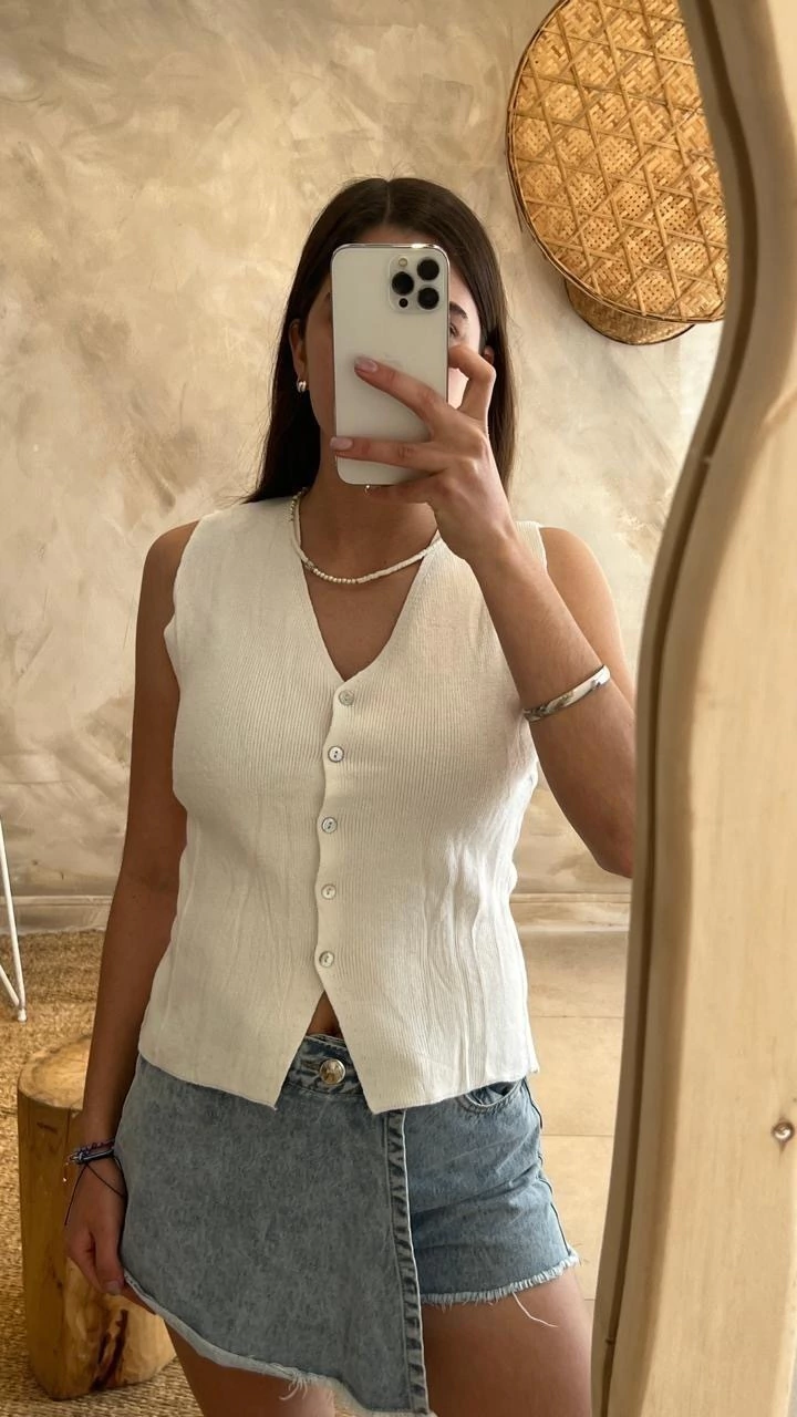 Descubrí el Chaleco Lu, una prenda importada que destaca por su diseño elegante y detalles únicos. Confeccionado en un tejido con hilo elástizado que incorpora pequeños brillos, este chaleco aporta una sutil luminosidad que realza cualquier outfit.