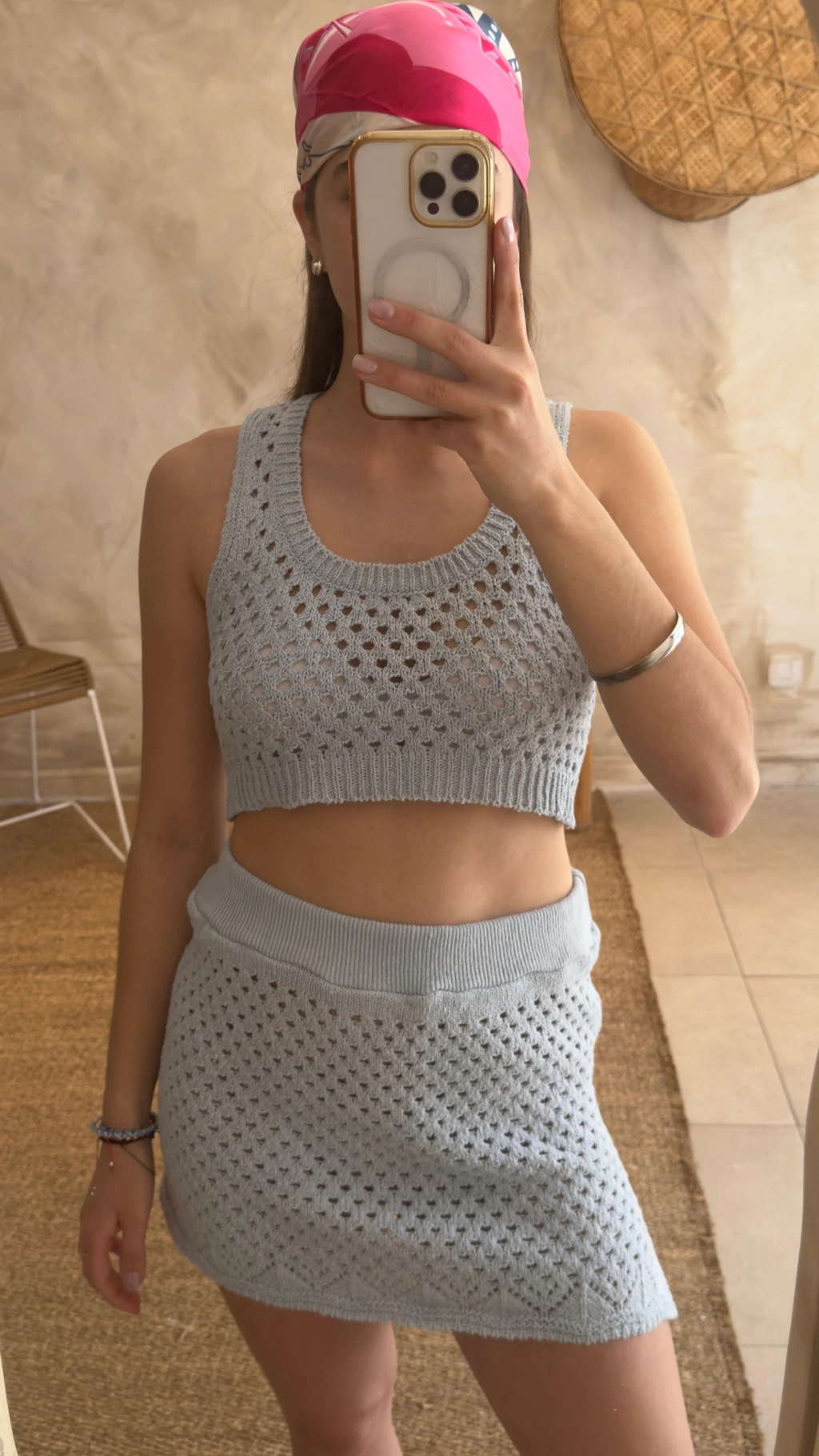 Conjunto Berta: delicadeza y estilo en conjunto de pollera y top calado en color celeste