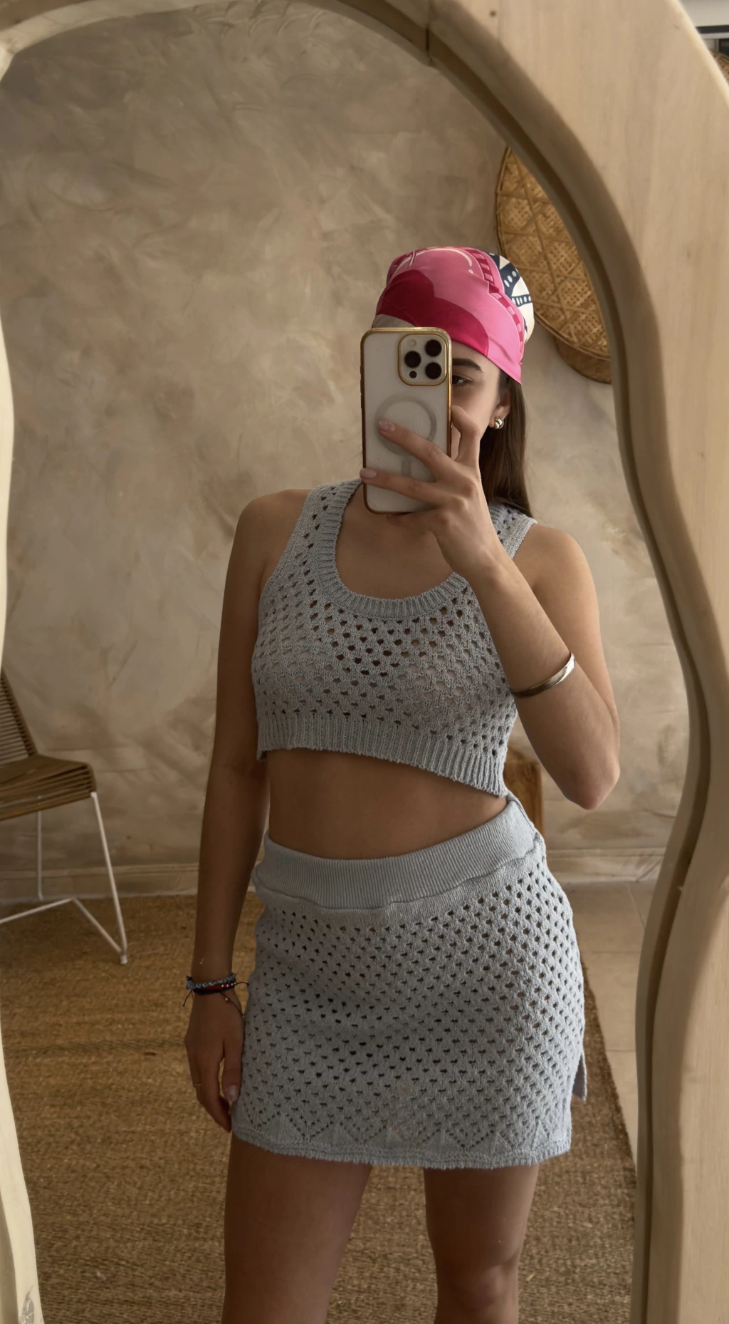 Descubrí la elegancia sutil y la frescura del conjunto de pollera y top calado en color celeste con el Conjunto Berta, una prenda diseñada para realzar tu estilo con comodidad y buen gusto.