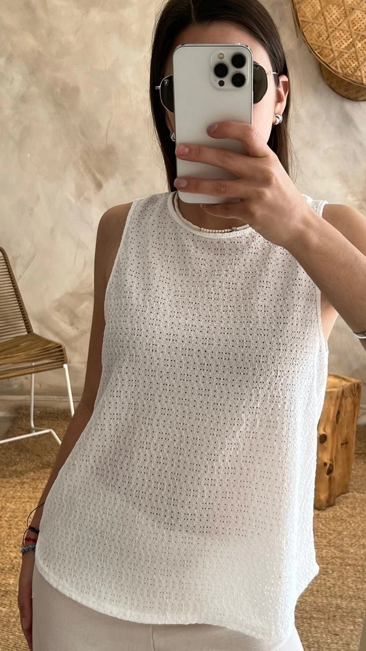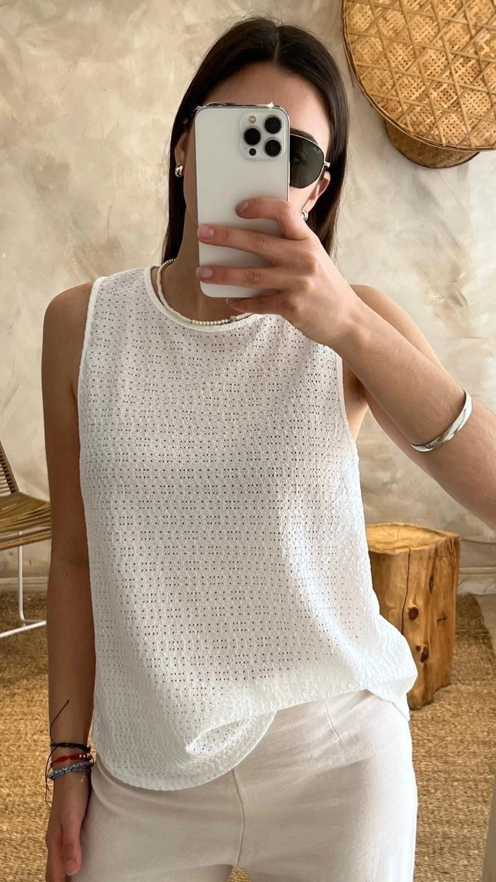 Elegí la Musculosa Giorgia y sentí la diferencia de vestir una prenda con personalidad, frescura y la delicadeza del broderie artesanal.