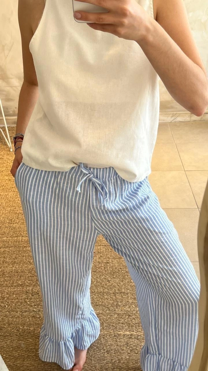 Descubrí el Pantalón Genoveva, una prenda que combina comodidad y estilo con un diseño único en lino rústico color celeste con líneas blancas. Su tejido liviano y natural es ideal para quienes buscan un look fresco y sofisticado, perfecto para las temperaturas de Argentina.