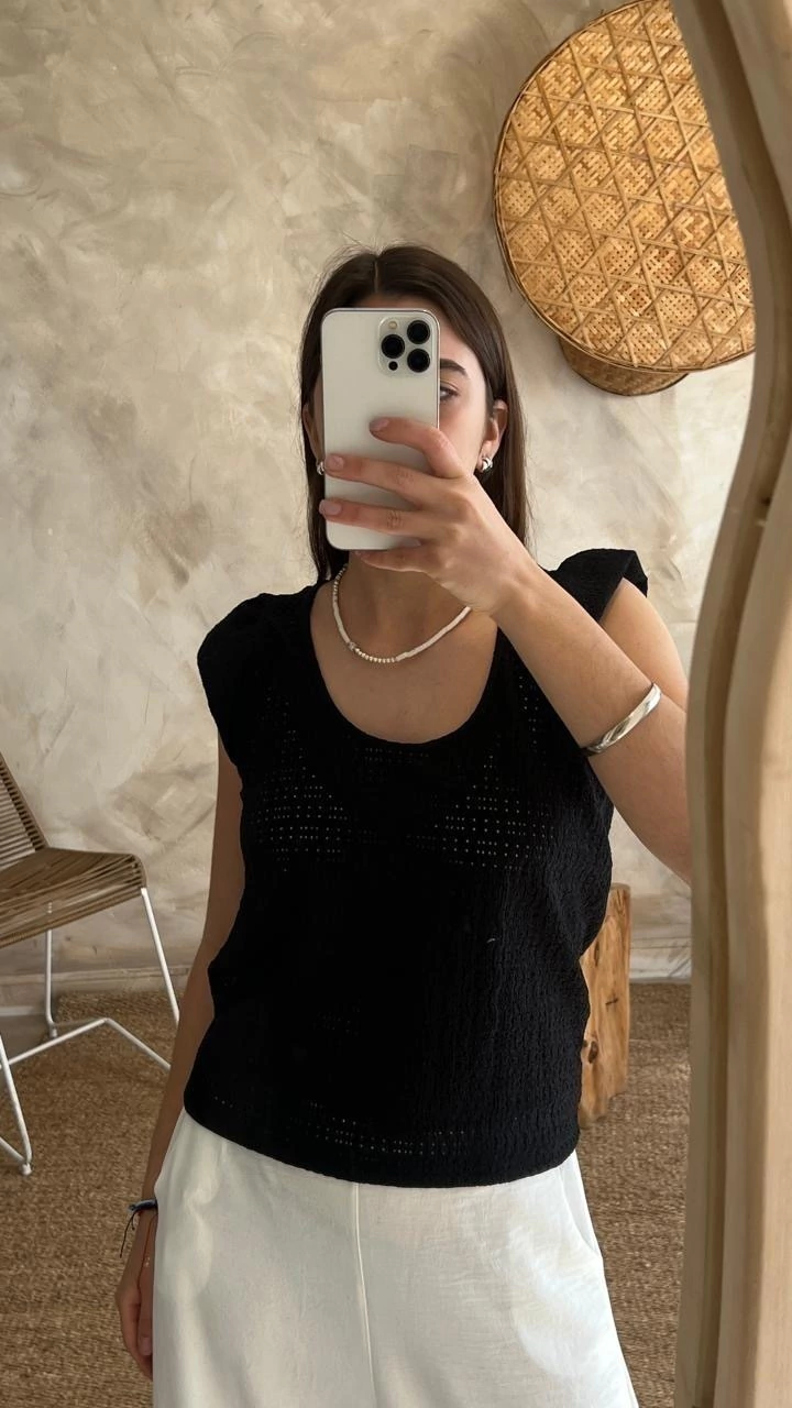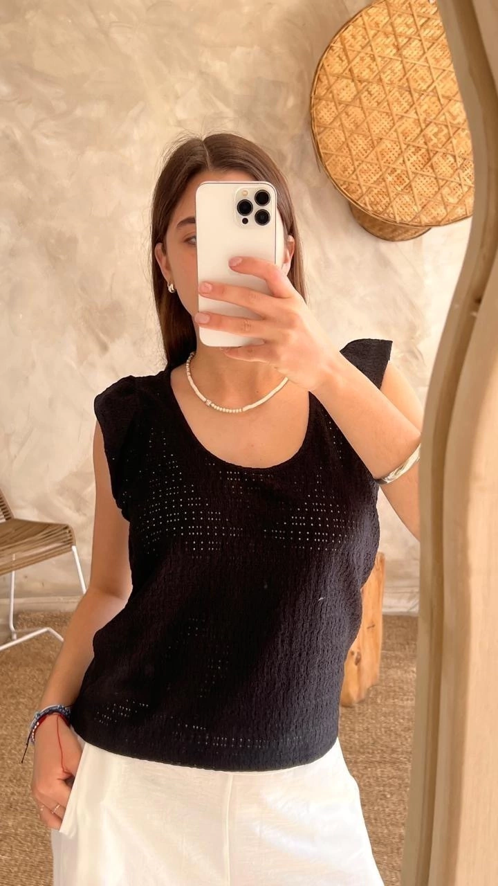 Descubrí la Remera Arabela, una prenda diseñada para quienes buscan un estilo moderno y femenino con un toque especial. Esta remera negra sin mangas destaca por su delicado falso broderie que aporta textura y sofisticación a tu look diario.
