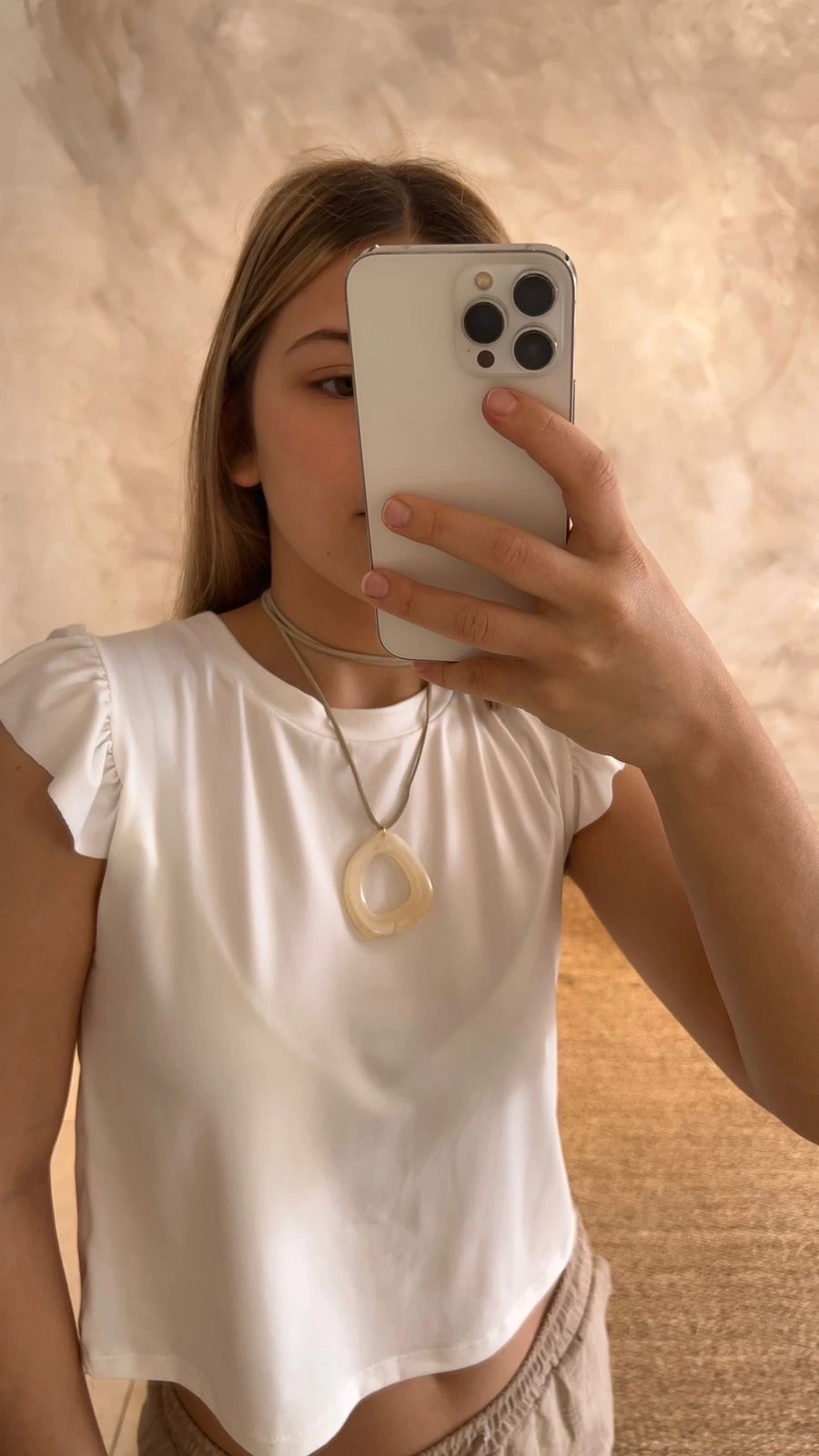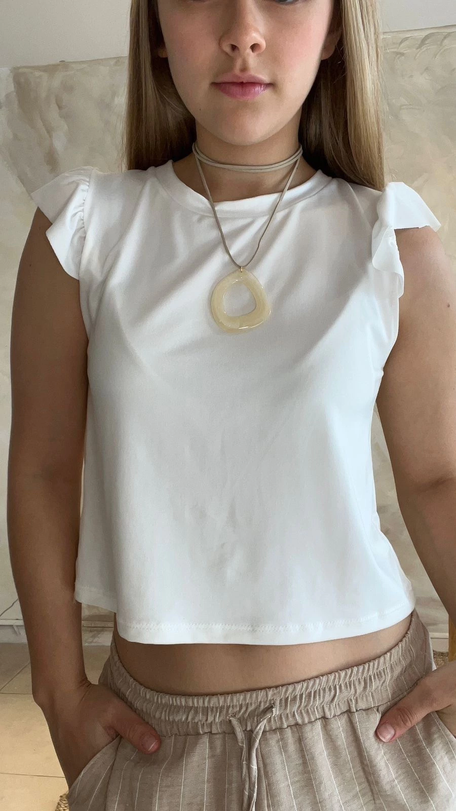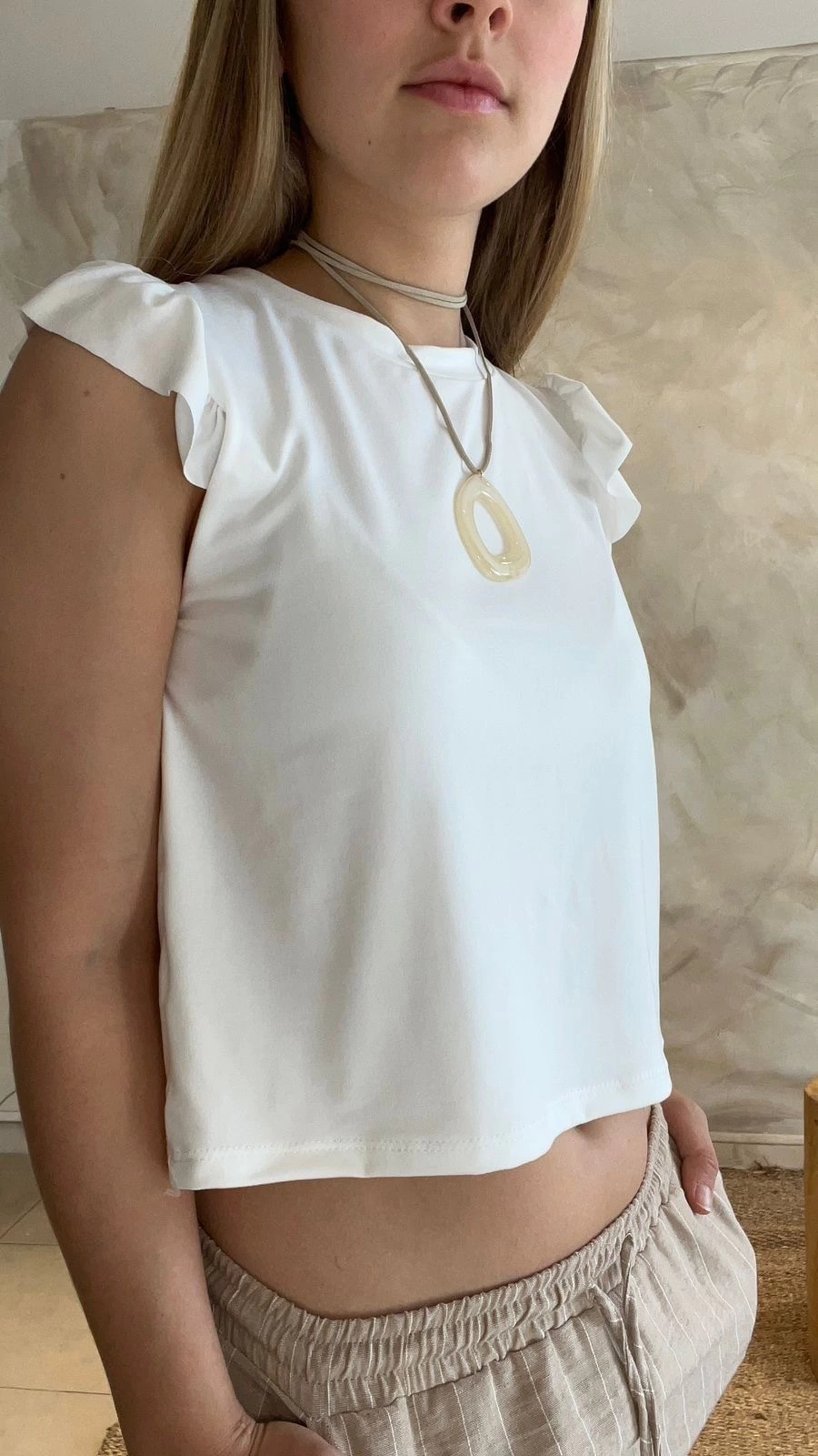 Su diseño destaca por los volados en las mangas, que aportan un toque femenino y delicado, ideal para quienes buscan sumar un detalle especial a su look. Además, el color natural combina fácilmente con distintos estilos y colores, haciendo de esta remera una pieza versátil en tu guardarropa.