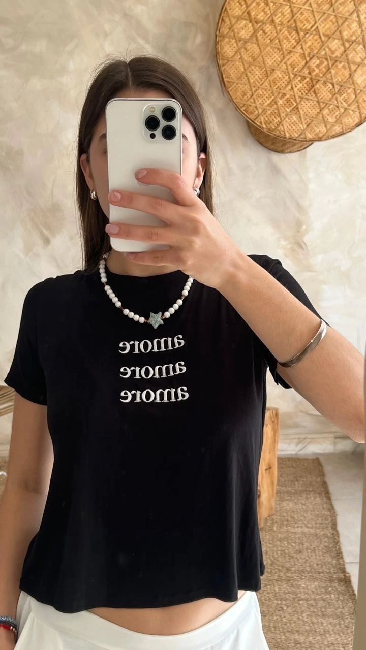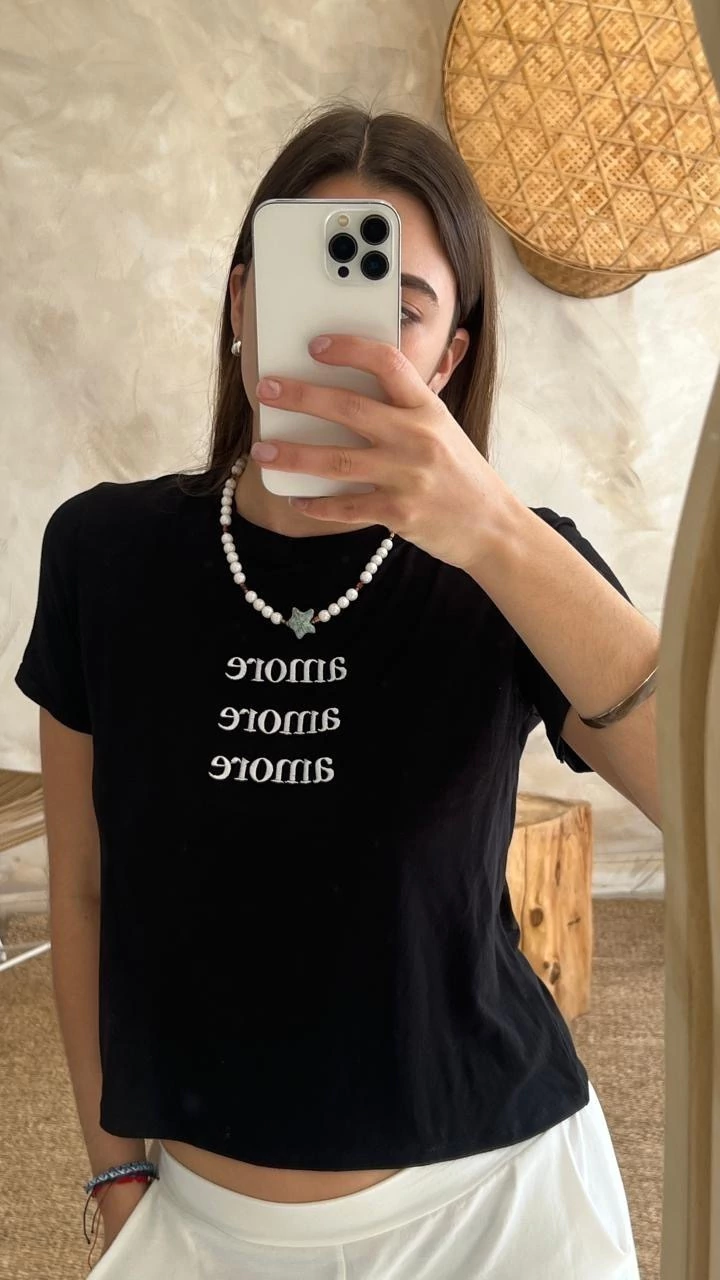 Descubrí la Remera Laura, una prenda esencial para tu guardarropa, confeccionada en una suave mezcla de modal con viscosa que garantiza una textura liviana y agradable al tacto. Su color negro clásico se combina con bordados en blanco que resaltan la palabra amore, aportando un detalle delicado y lleno de significado para quienes buscan un estilo único y sofisticado.