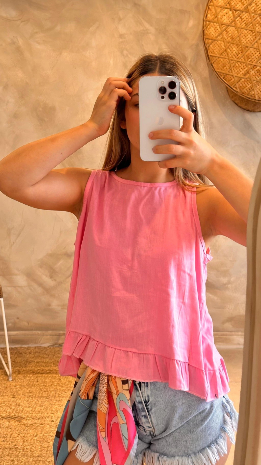 Esta remera tipo musculosa se destaca por los volados en los hombros, que aportan un detalle romántico y sofisticado. Además, cuenta con una abertura en la espalda que suma frescura y un estilo único para los días cálidos.