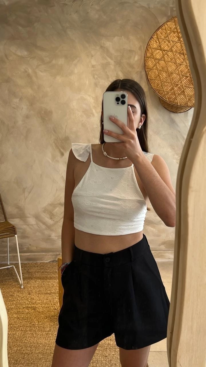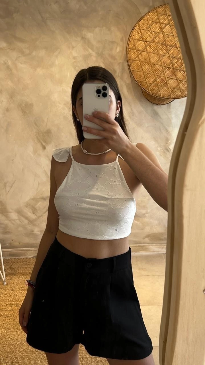 Descubrí el Top Freya, una prenda diseñada para quienes buscan comodidad y estilo en una pieza única. Confeccionado en lycra color natural, este top corto se destaca por sus delicados detalles de broderie que aportan un toque femenino y sofisticado.