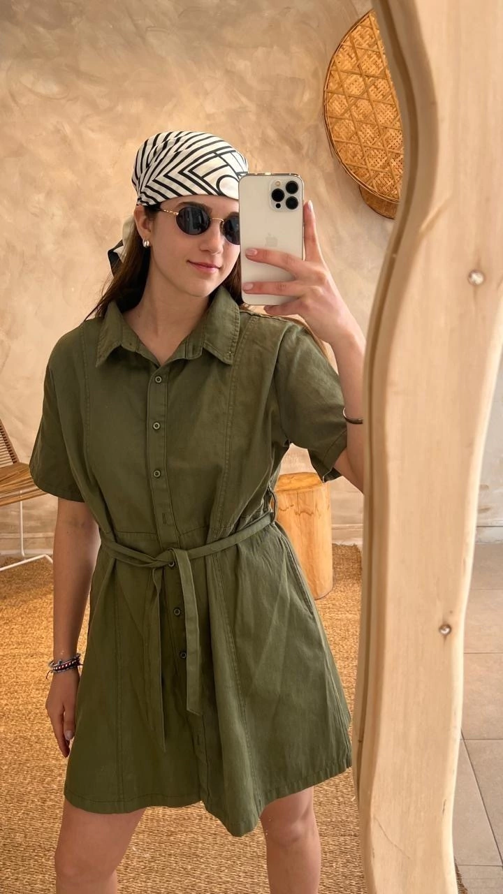 Descubrí el Vestido Casia, una prenda que combina la frescura de un diseño corto estilo jean con la funcionalidad de un vestido todo abotonado al frente. Su color verde militar aporta un aire sofisticado y versátil, ideal para lucir en diferentes ocasiones.